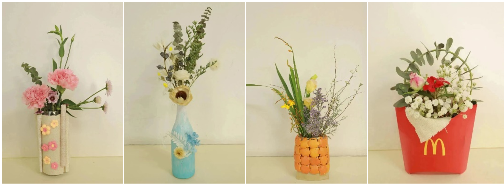 作品内容:利用废塑料瓶、塑料袋等废弃物原材料,结合花、黏土等装饰品,使用剪刀、热熔胶枪等器材,将废弃物进行设计与加工,做成精美的手工艺品。